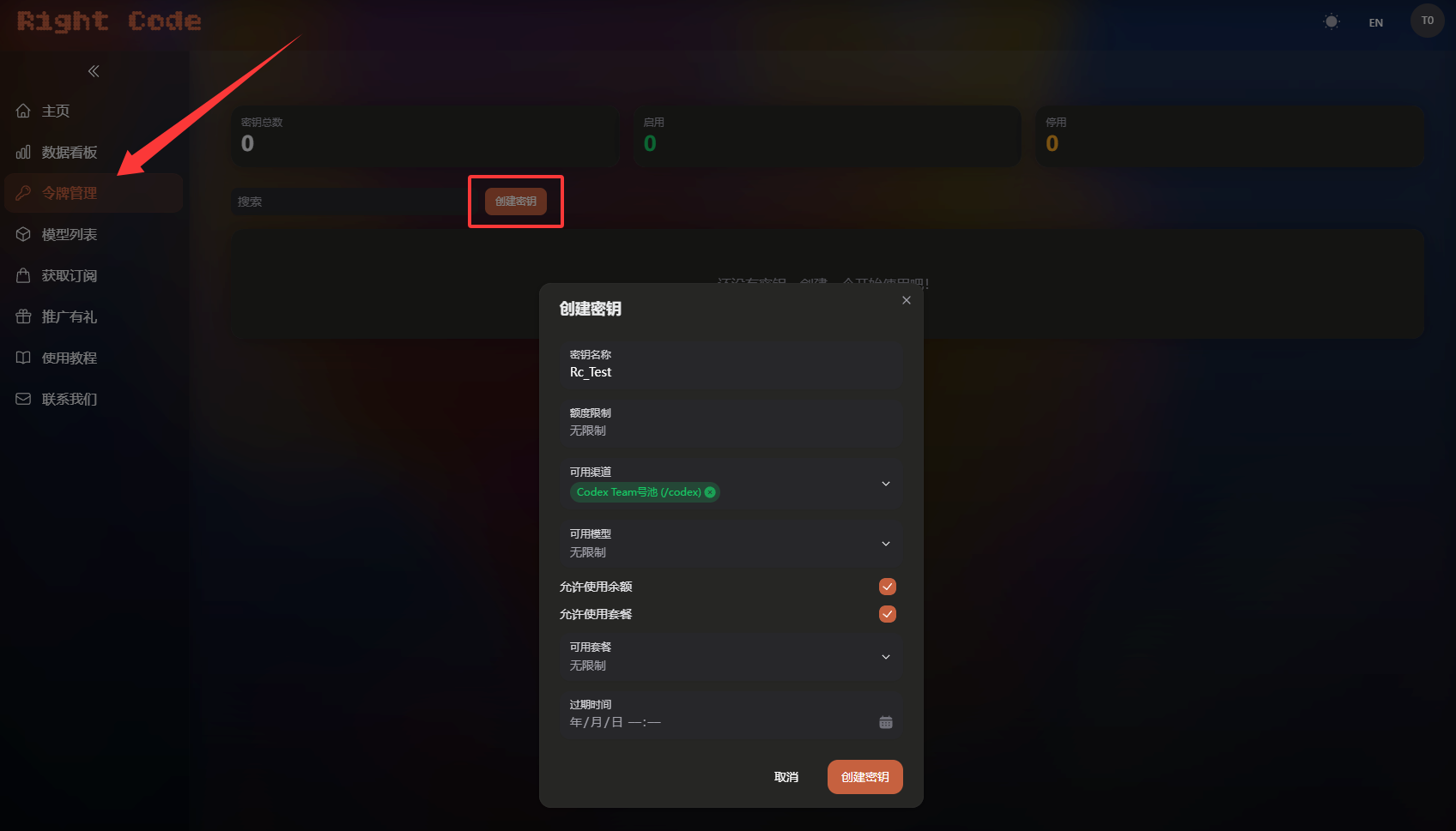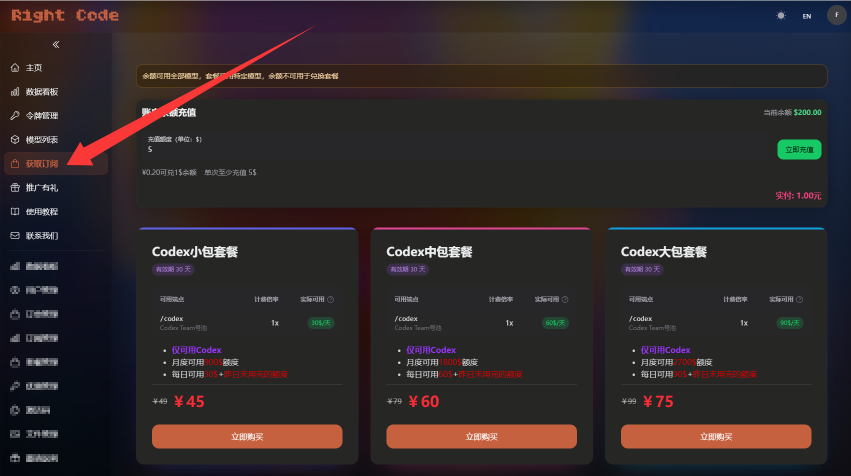 获取订阅一栏如图所示,最上方为额度充值,如果你想按量使用,直接充值余额即可,我们的充值倍率可查看 额度与套餐定价 部分