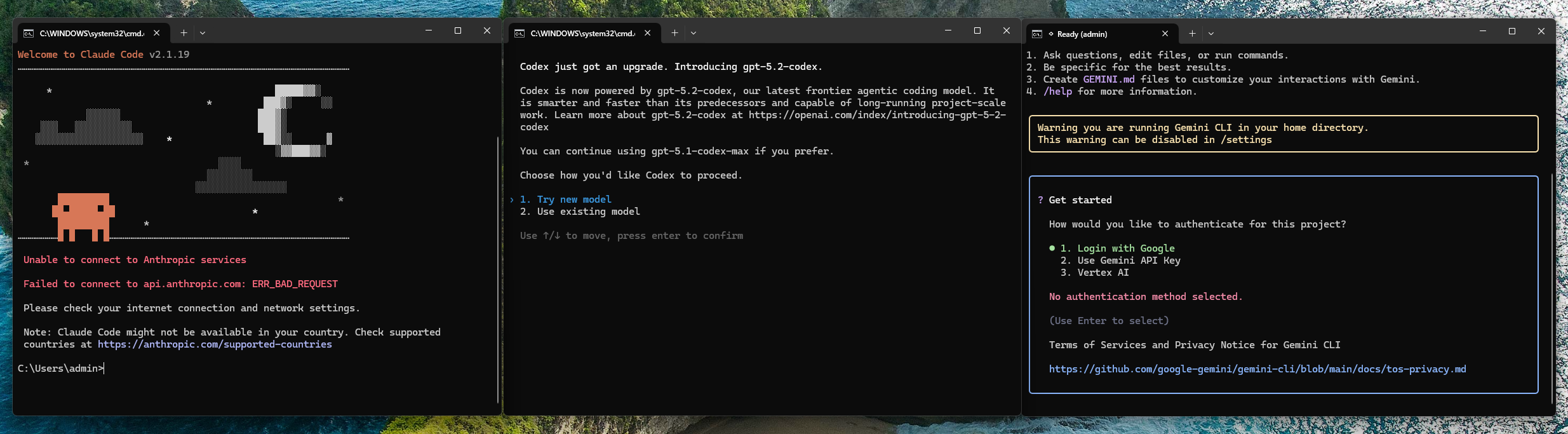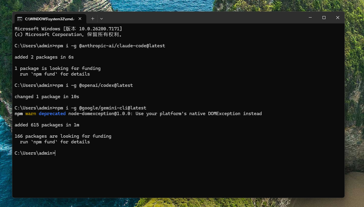 打开三个终端,分别运行Claude Code、Codex、Gemini的CLI,如果有界面,说明没有问题了,不需要管其他的报错!